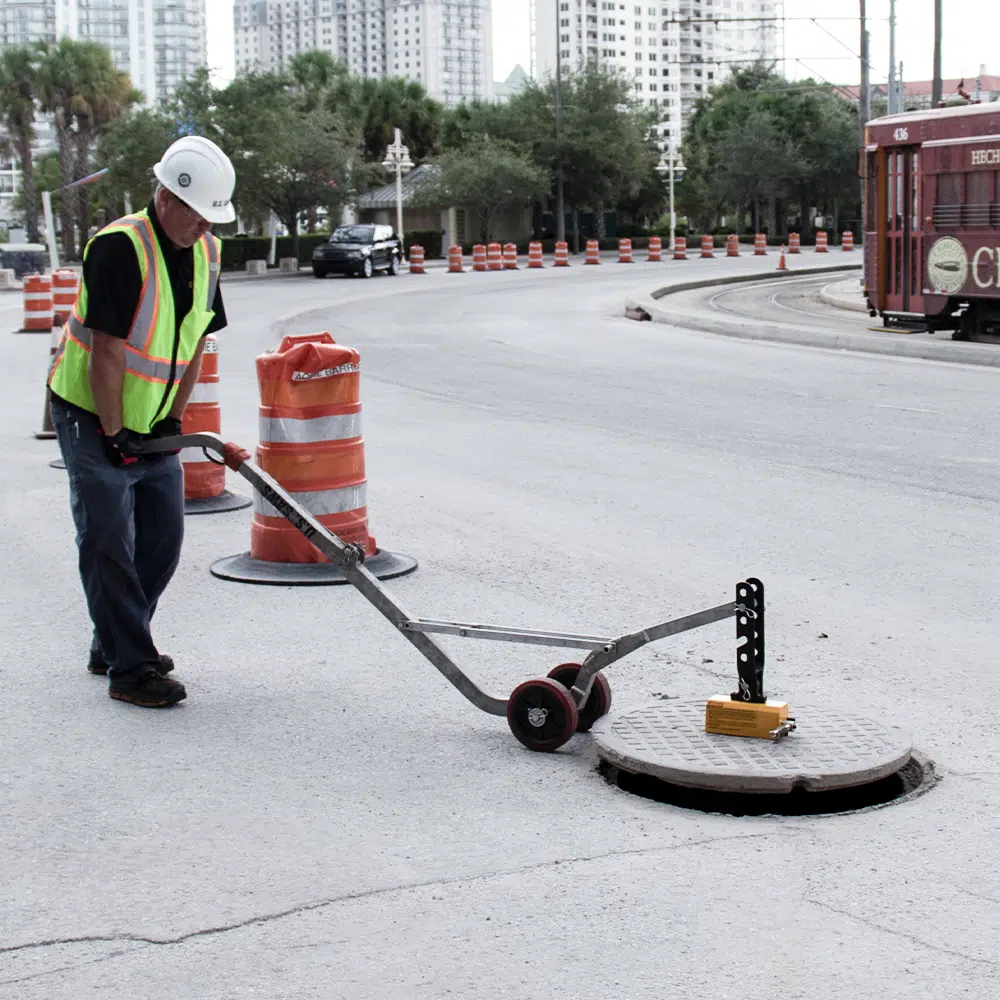 - For safety, the magnet must be in contact with the manhole cover to be engaged