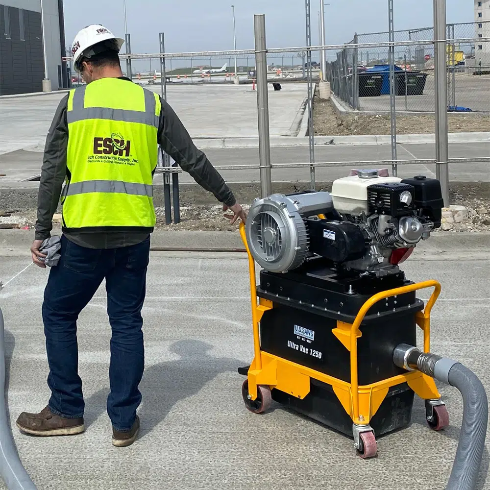 The Ultra-Vac 1250-G is a heavy duty vacuum designed for collecting concrete dust where a gas powered engine is most convenient. The 1250-G is the preferred vacuum system for the JS-130 & JS-160P Joint Cleanout Saw, the CC-100 Crack Chaser and a variety of Early Entry Saws. The wide, flat wheels make it a good choice for early entry control joint cutting as they will lessen the possibility of indentations in the slab. The vacuum is constructed of an all steel tube frame with a polyethylene body for years of use and abuse.