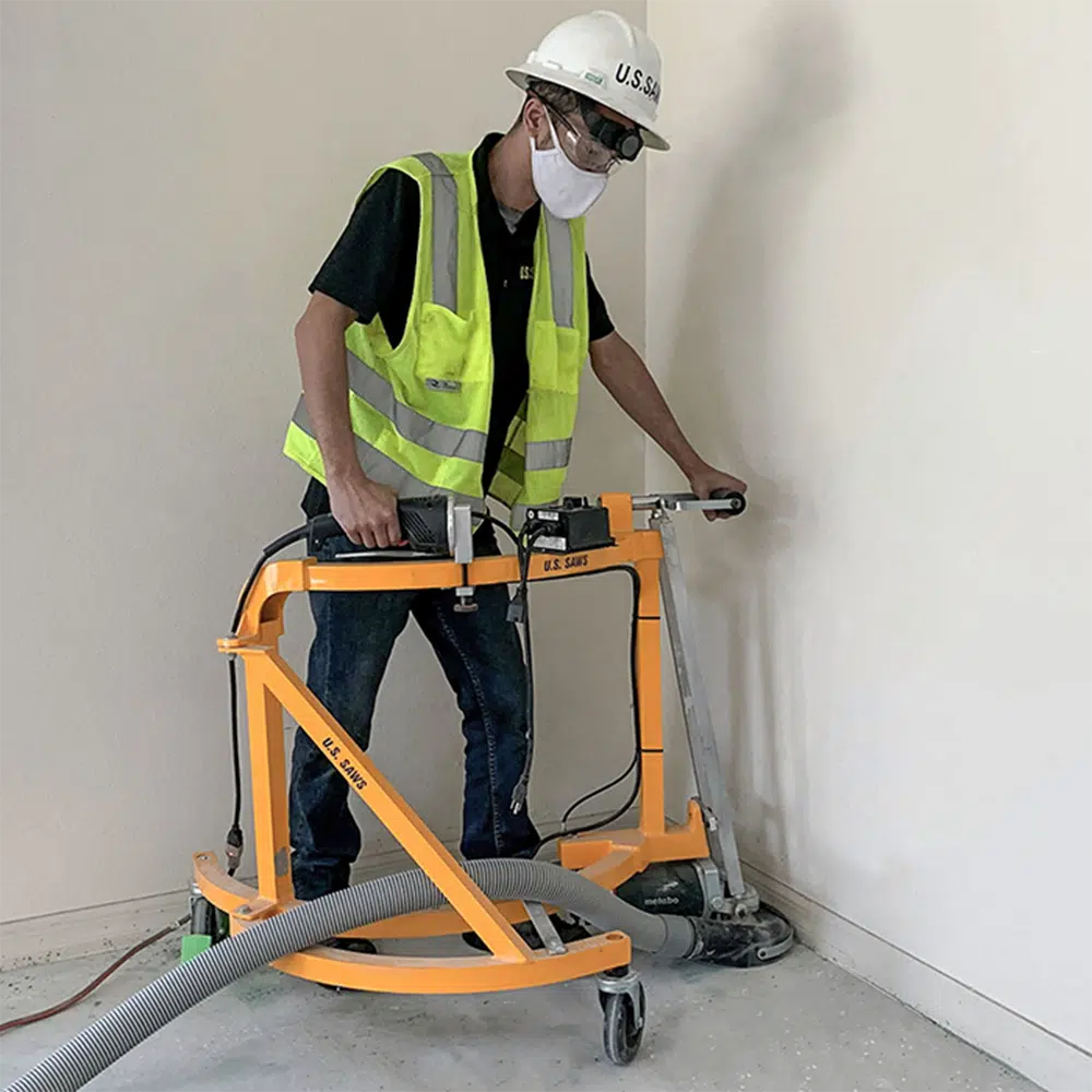 The most innovative concrete edge grinder on the market, the TC-7 Stand-Up Edger, is designed to give the operator the feel of a handheld grinder while maintaining a comfortable upright position. A rear control lever allows the operator to adjust the grinder pitch, while the front handle allows side-to-side movement for complete control and the ability to feel the contours of the surface being ground. U.S.SAWS designed the TC-7 Edger for grinding and polishing concrete surfaces near walls and other vertical surfaces. It can also be used in open spaces where it is impractical to mobilize a large planetary. Small rooms, offices, garages, kitchens, and bathrooms are examples of where this machine will be more efficient than a large machine. On larger projects with long straight edges, nothing on the market is more efficient than this machine. This floor grinder utilizes 7″ diamond cup wheels or polishing pads to prep or polish. The TC-7 Edger features the U.S.SAWS Generation 2 dust shroud system for a clean, dust-free work environment.