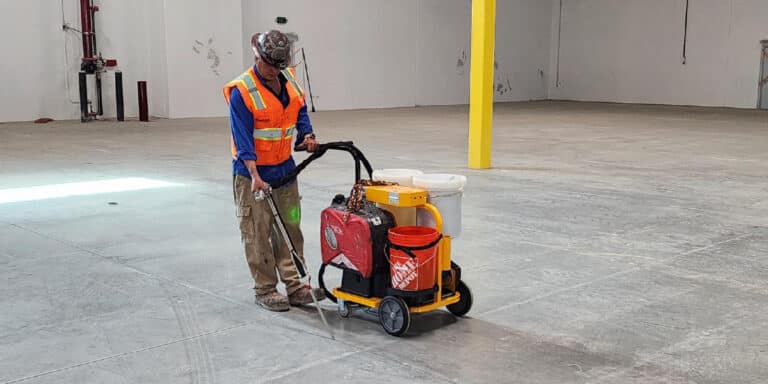 A worker operates a concrete saw machine on a large indoor floor surface.